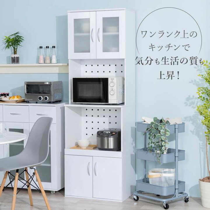 楽天市場 食器棚 電子レンジ台 キッチン収納 カップボード キッチンボード キッチン 鏡面 ミストガラス扉 収納 棚 ラック 食器 炊飯器 トースター ストック収納 台所 収納 シンプル ホワイト 幅59 奥行40 高さ180 A インテリアショップファンボヌール